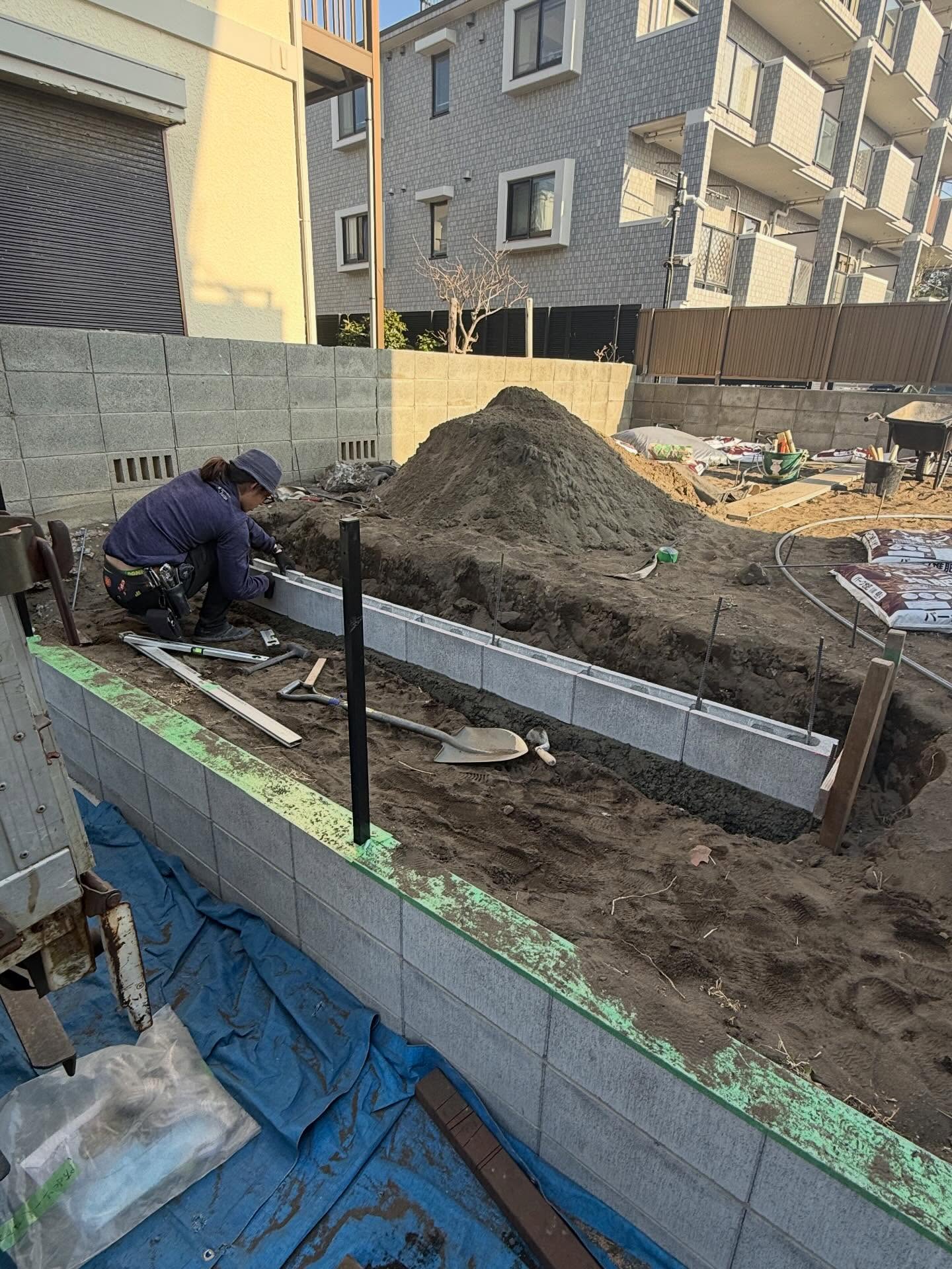 今日は新しいお庭の土留めでブロック積みやってました。今回は入社してそろそろ1年の2人で施工。まだまだ勉強中だけど、ひとつずつ確認しながら進めました。完成したらあまり目立たない部分だけど、こういう土台づくりがかなり大事。少しずつ形になっていくのがやっぱり楽しいです。完成までしっかり頑張ります!ます!#造園 #造園業 #庭づくり #外構 #土留め