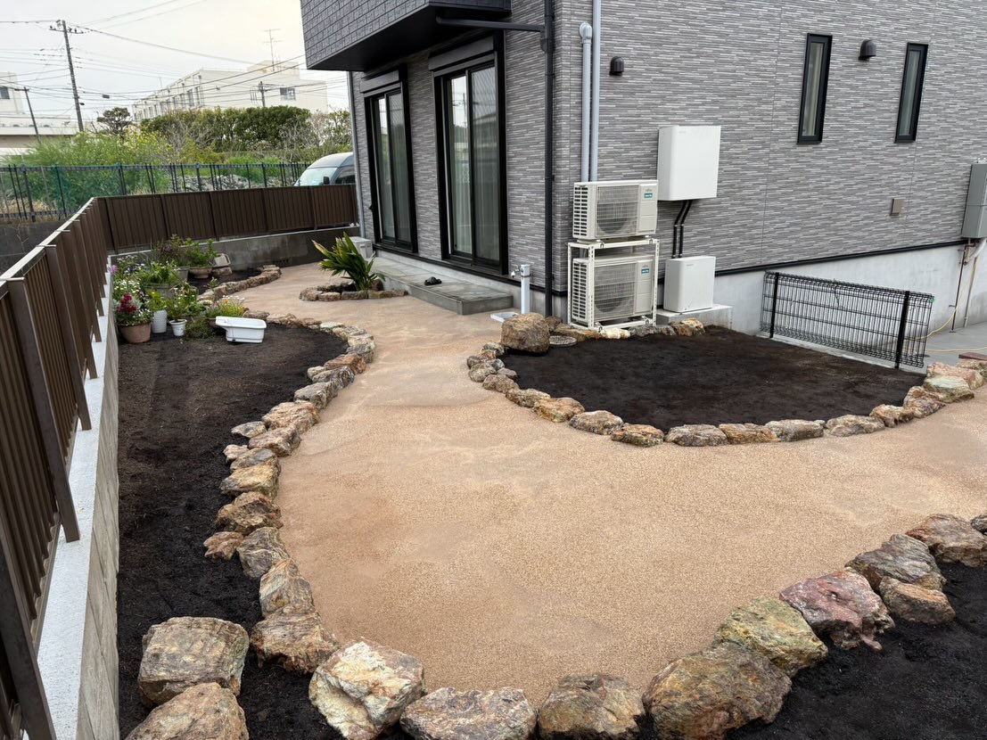 園路に楽土を施工して仕上げましたしっかり締まって歩きやすく、見た目もやわらかい雰囲気に。石組みとの相性も◎で、庭全体がまとまりました。これから植栽も始まりますので楽しみにお待ちください#外構 #庭づくり #造園 #園路 #楽土